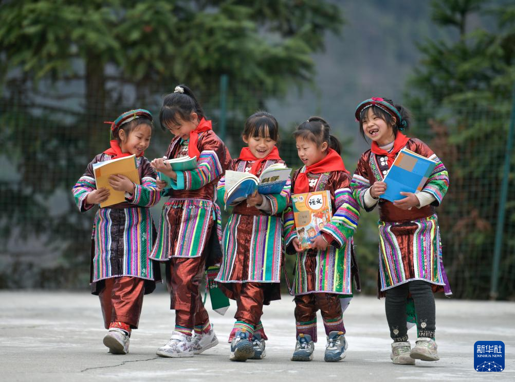 2023年2月16日,在贵州省从江县西山镇中寨教学点,领到新书的瑶族学生在一起交流。“十四五”时期,我国教育事业取得历史性成就,义务教育全国2895个县域实现基本均衡。