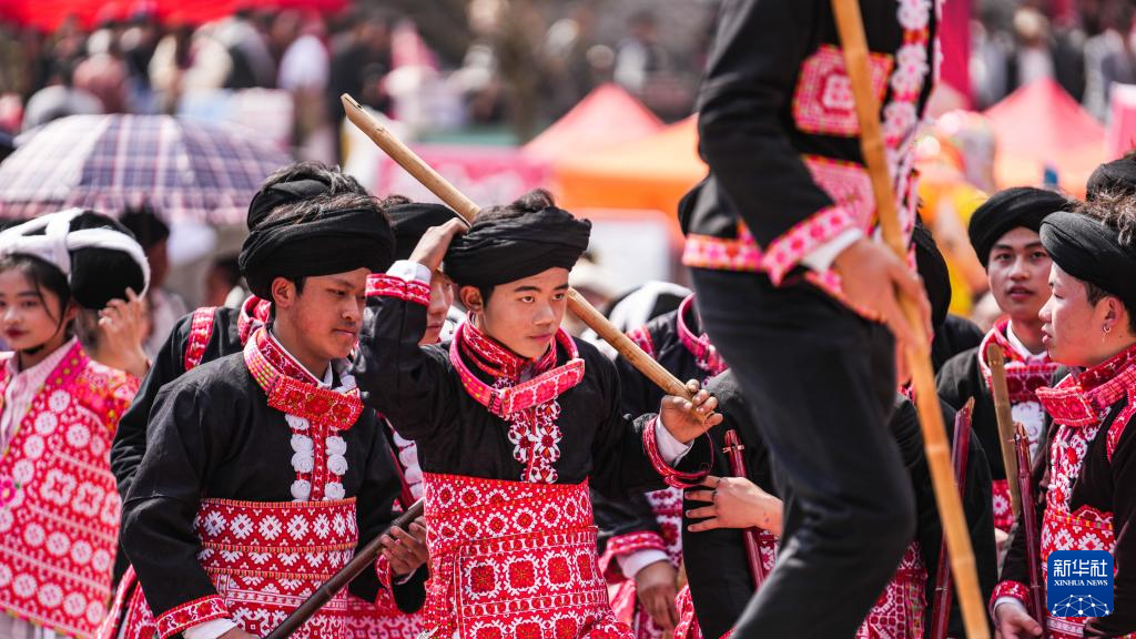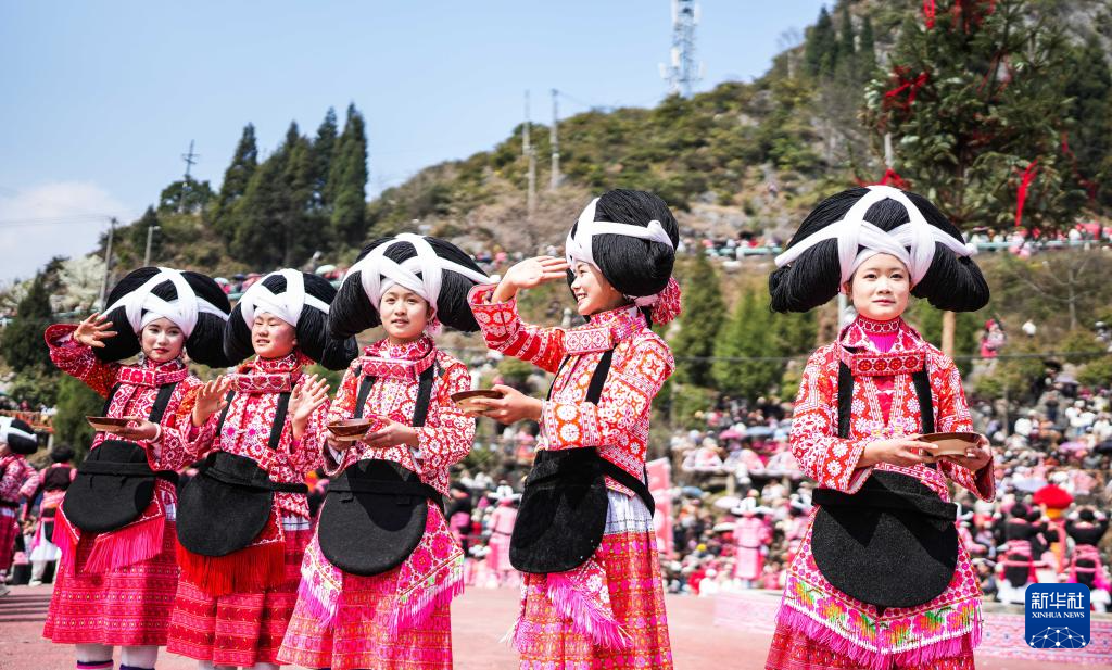 2月26日,在贵州省六盘水市六枝特区梭戛苗族彝族回族乡高兴村跳花场,苗族群众在表演舞蹈。