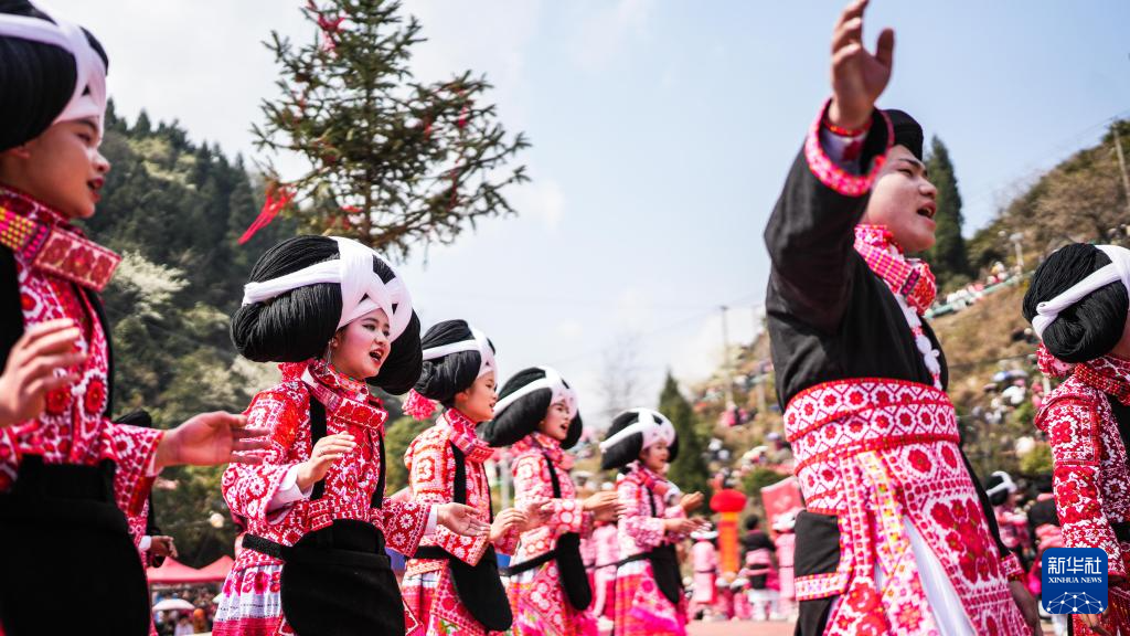 2月26日,在贵州省六盘水市六枝特区梭戛苗族彝族回族乡高兴村跳花场,苗族群众在演唱祝酒歌。新华社记者 陶亮 摄