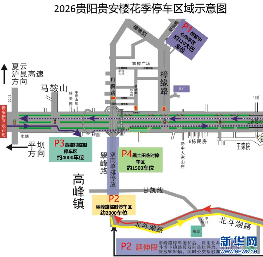 自2026年3月7日起至3月下旬(将根据花期动态调整),交管部门构建“远端分流、中端管控、近端疏导”全链条交通组织体系,对贵安大道、翠峰路、樟缘路、丹枫路等关键路段实施分级分类管控。贵安大道马鞍山至马场特大桥路段双向禁停、封闭沿线开口,贵阳往安顺方向辅道仅限保障类车辆通行;翠峰立交高峰往丹枫路车道、丹枫路分别实施专项管控,保障应急与摆渡车辆通行;樟缘路每日7时至20时实行限制通行,兼顾园区居民出行与游客秩序。贵安大道与百马大道互通、小河湾及马鞍山路口同步实施渠化引导,精准导引车流前往停车区域。遇大流量情况,将适时启动大型货车限时通行,相关措施另行通告。