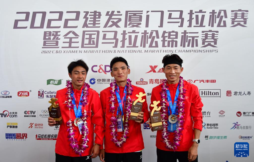 2022年11月27日,2022厦门马拉松男子组冠军丰配友(中)、亚军高鹏(左)和季军吴向东在颁奖仪式后合影。新华社记者 魏培全 摄