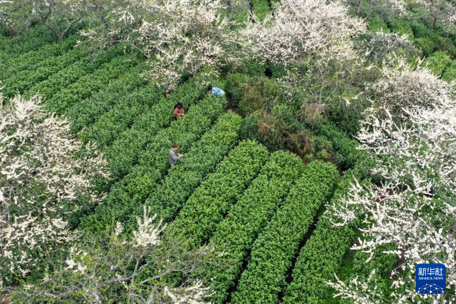 3月20日,茶农在贵州省遵义市余庆县龙溪镇的茶叶基地采茶(无人机照片)。新华社发(周磊摄)
