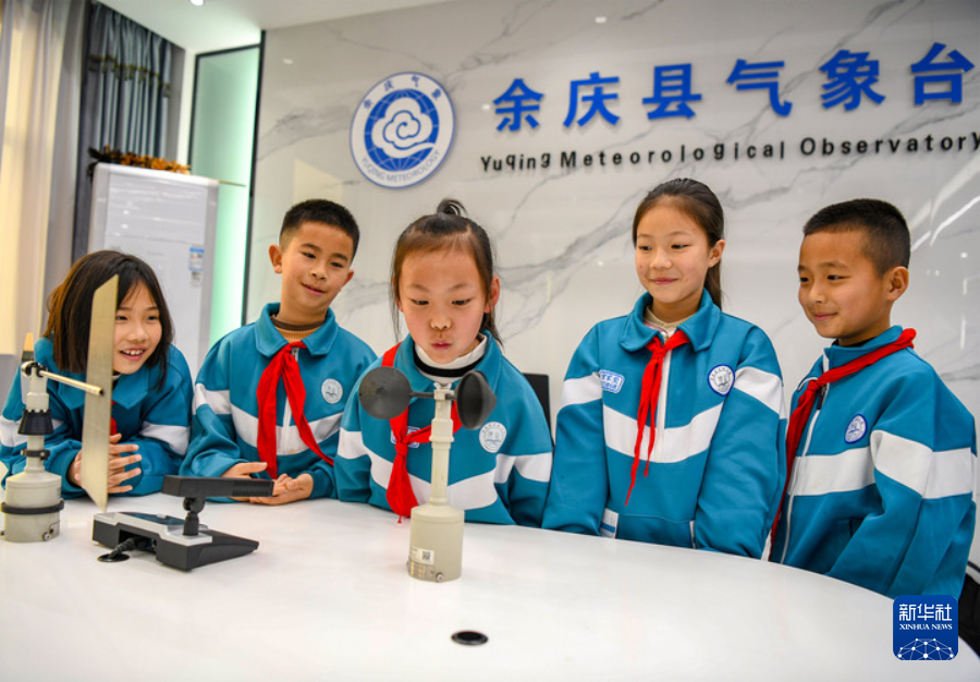 3月23日,在贵州省遵义市余庆县气象台,学生在体验风向风速仪。
