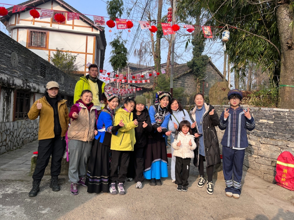 陈星星(右四)和她通过网上宣传吸引而来参加下院村“村宴”活动的游客合影。鄢永华摄