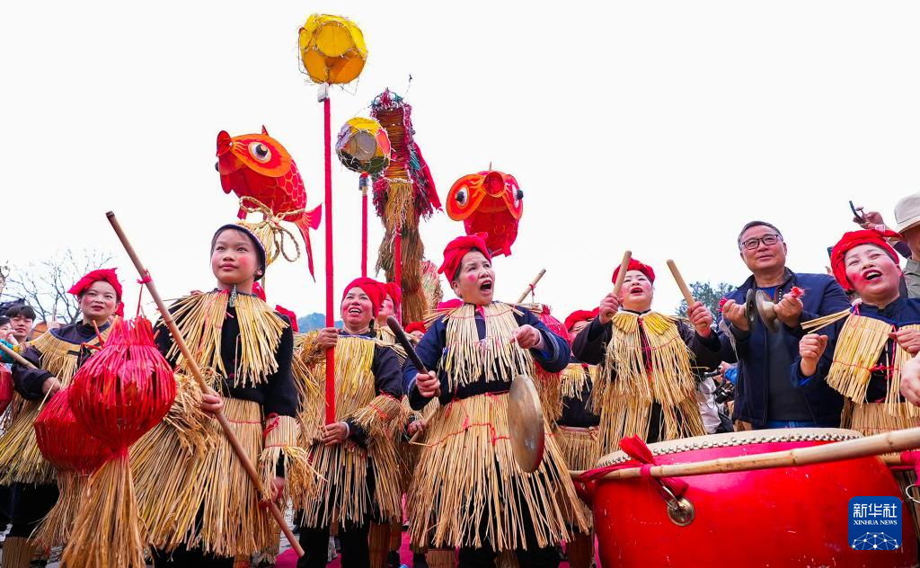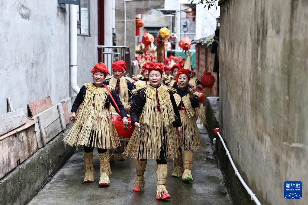 3月28日,在贵州省榕江县三宝侗寨,侗族妇女身着稻草衣参加“萨玛节”活动。新华社发(杨文舒摄)