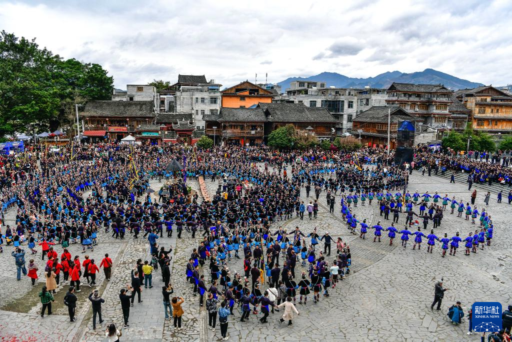 3月28日,在贵州省榕江县三宝侗寨,侗族群众跳千人多耶舞欢庆“萨玛节”(无人机照片)。