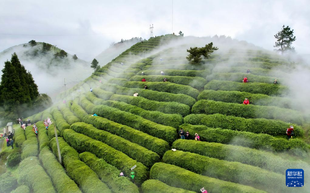 村民们在螺蛳壳茶山采茶。新华社发(冯小东摄)
