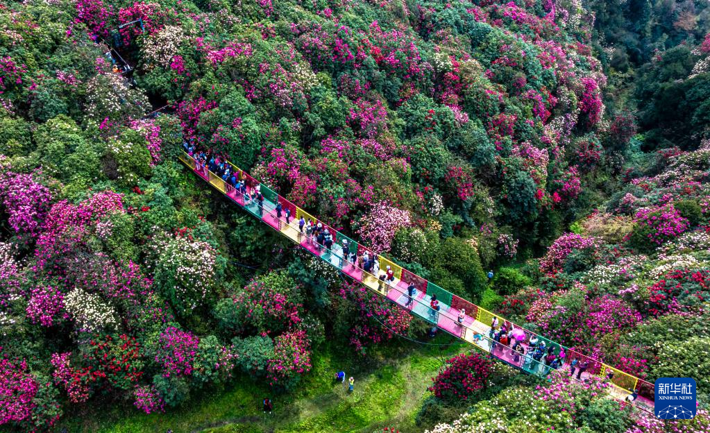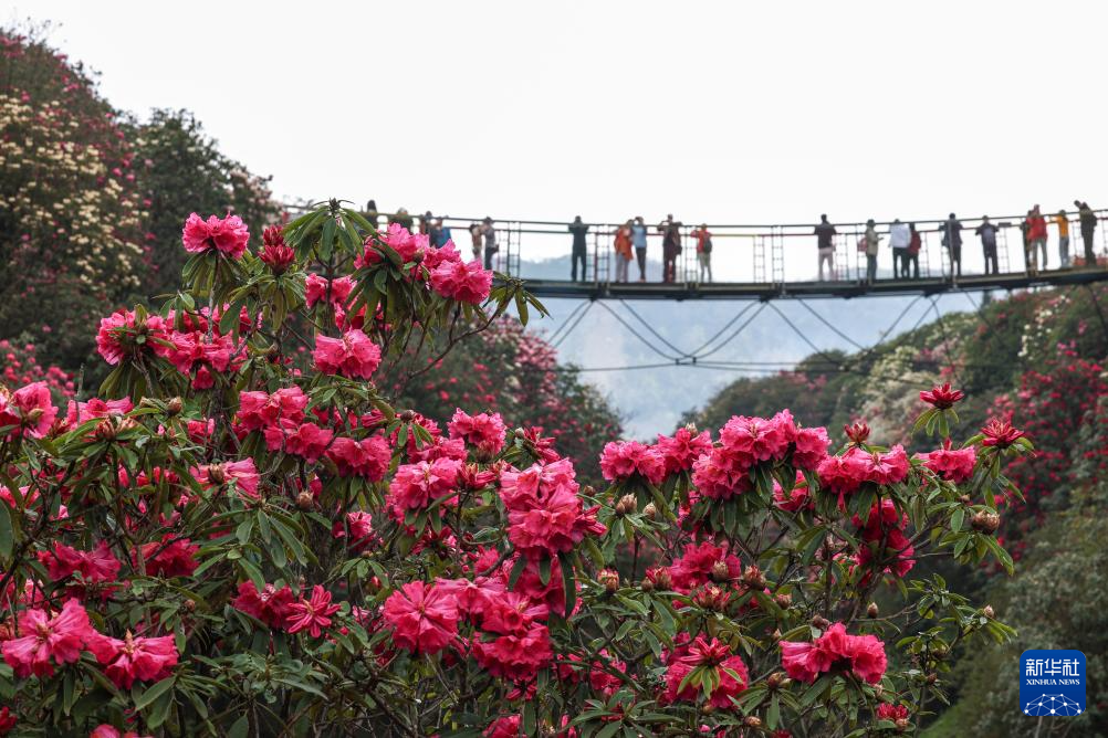 4月1日,游客在百里杜鹃管理区金坡景区一处吊桥上赏花。新华社记者 杨文斌 摄