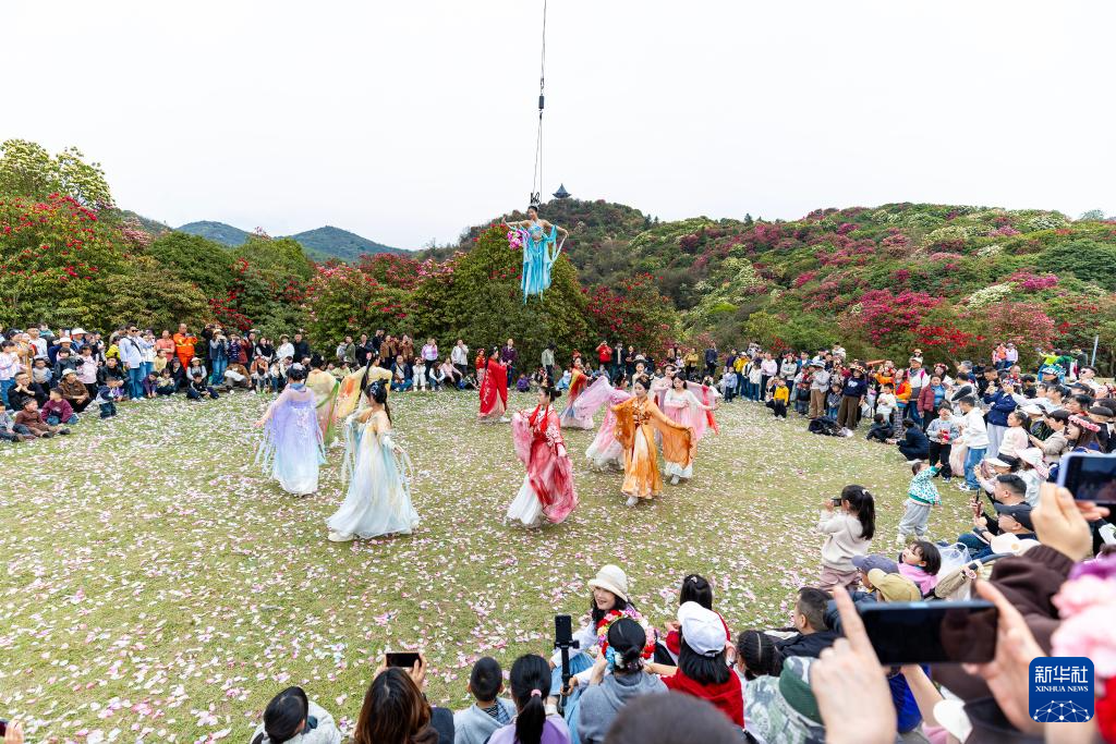 3月26日,“花仙子”在百里杜鹃管理区普底景区为游客表演“天女散花”。新华社发(范晖摄)
