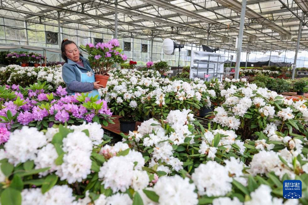 3月28日,工人在百里杜鹃管理区汇境花卉科技园管护杜鹃花苗。新华社发(韩贤普摄)