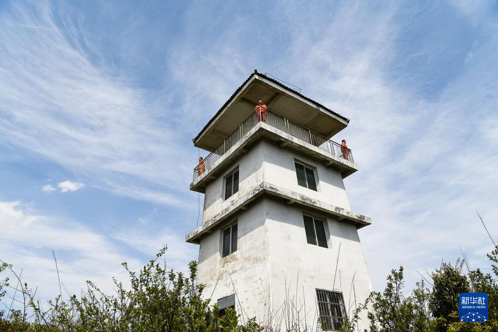 森林防火队员在贵州百里杜鹃管理区金坡景区的一处瞭望塔上查看林区情况(2020年4月28日摄)。新华社发(周燕林 摄)