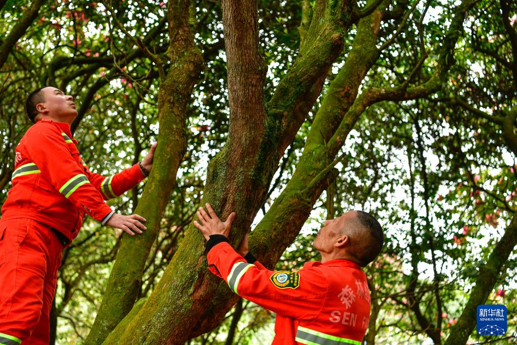 在贵州百里杜鹃管理区金坡景区,森林防火队员在查看一棵杜鹃树病虫害防治情况(4月2日摄)。新华社记者 杨文斌 摄