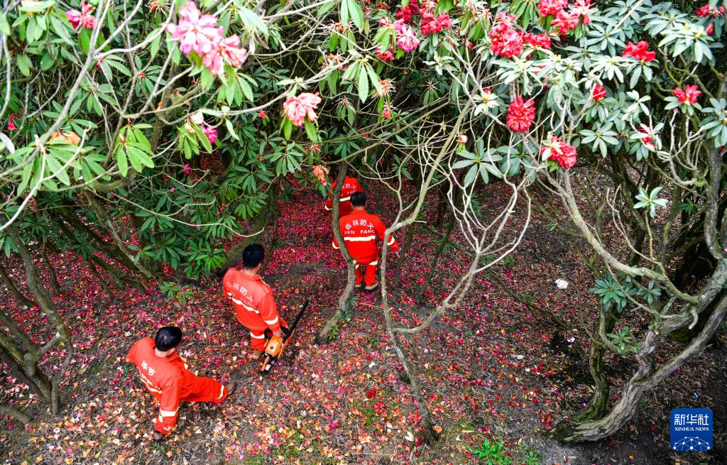 在贵州百里杜鹃管理区金坡景区,森林防火队员们在巡逻途中清理一棵倒伏的杜鹃树(4月2日摄)。新华社记者 杨文斌 摄