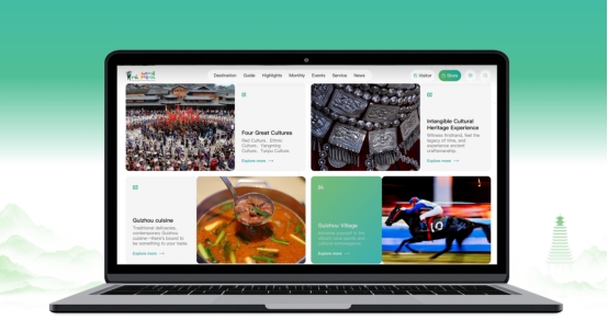 在文旅推介方面,Guizhoutravel.com打造了探索目的地、旅行攻略、特色贵州、月见贵州、活动展演、服务向导、新闻资讯等七大板块,充分运用短视频、VR全景等多种交互形式,分主题、分季节展示贵州自然景观与民族文化,并以高品质“宣传视频+图文攻略+真实体验”集合丰富有趣的贵州新玩法。