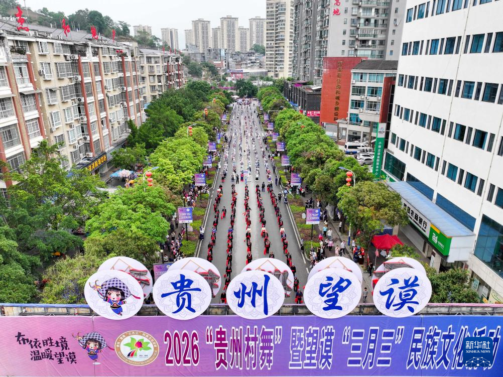 4月19日,在贵州省黔西南布依族苗族自治州望谟县,人们身着盛装参加民族大联欢巡演活动(无人机照片)。新华社发(袁福洪摄)
