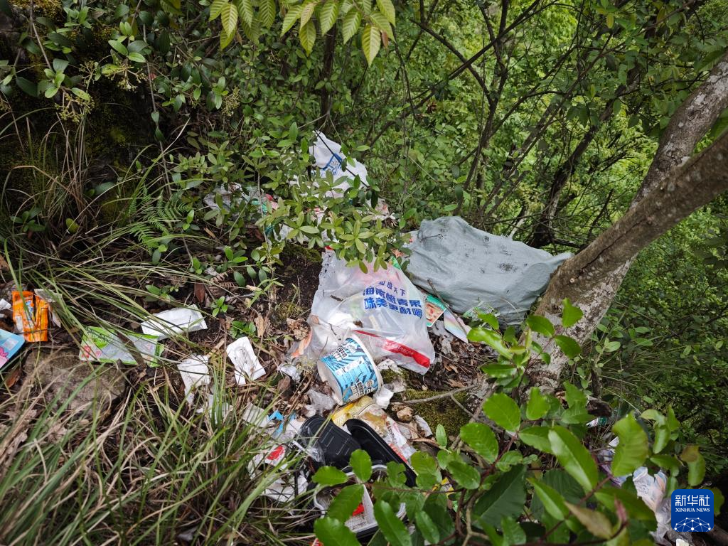 那些被随意丢弃的塑料瓶、食品包装袋、易拉罐、一次性餐盒、果皮纸屑等垃圾,散落在密林草丛,卡在陡峭岩缝,甚至漂浮在水面,在漫山苍翠中格外扎眼。山顶四周,还有部分垃圾已被游客用塑料袋装好,却并未被带下山。