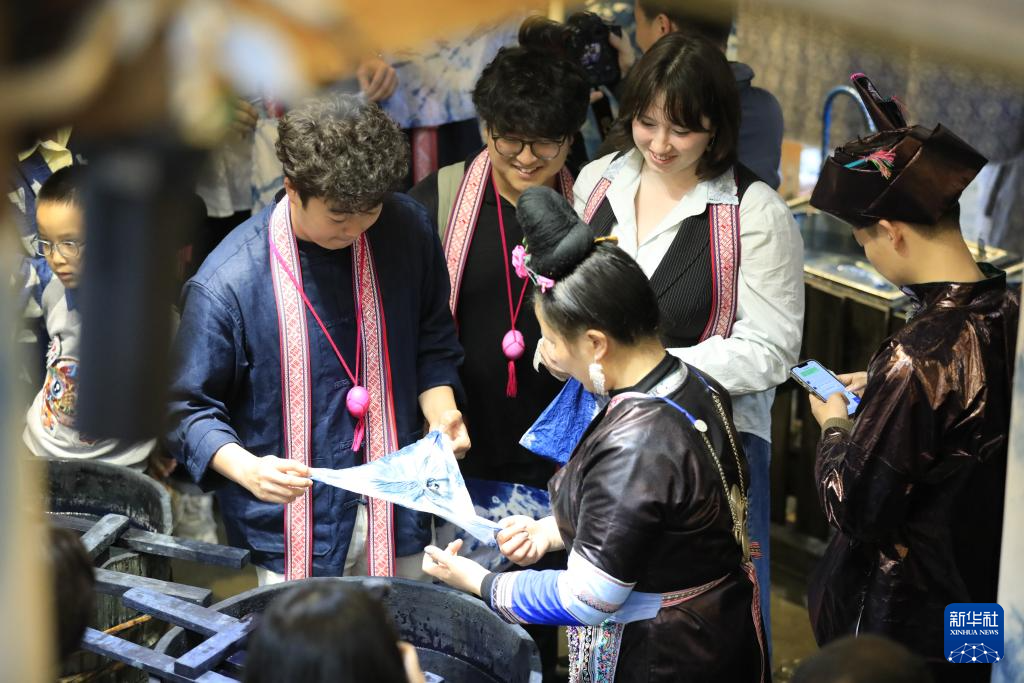 3月23日,外国游客在肇兴侗寨体验靛染。新华社发(吴光辉 摄)