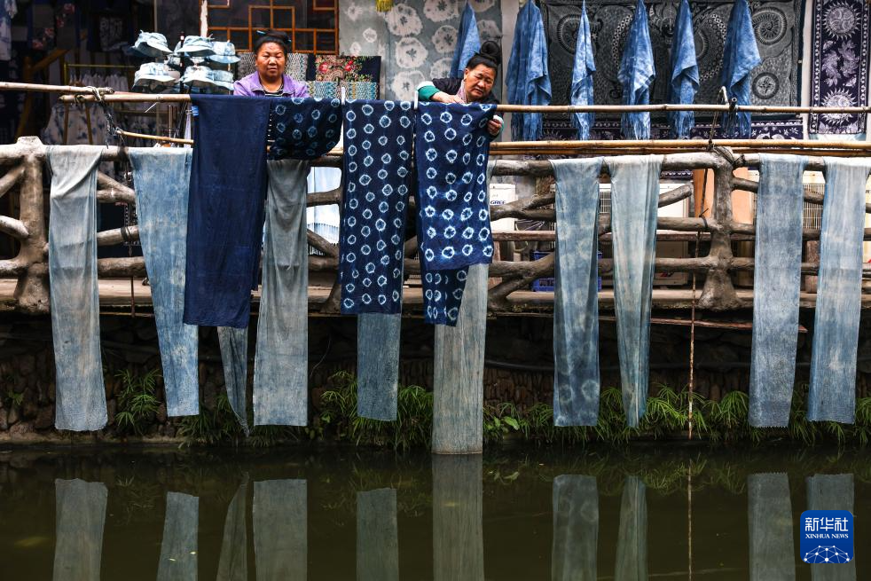 4月21日,贵州省黎平县肇兴侗寨的侗族妇女陆红英(右)与村民晾晒靛染作品。新华社记者 杨文斌 摄