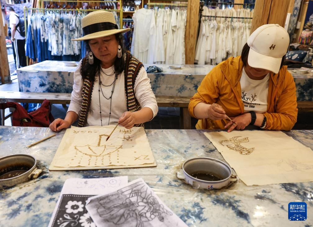 4月20日,游客在贵州省黎平县肇兴侗寨体验蜡染技艺。新华社记者 杨文斌 摄