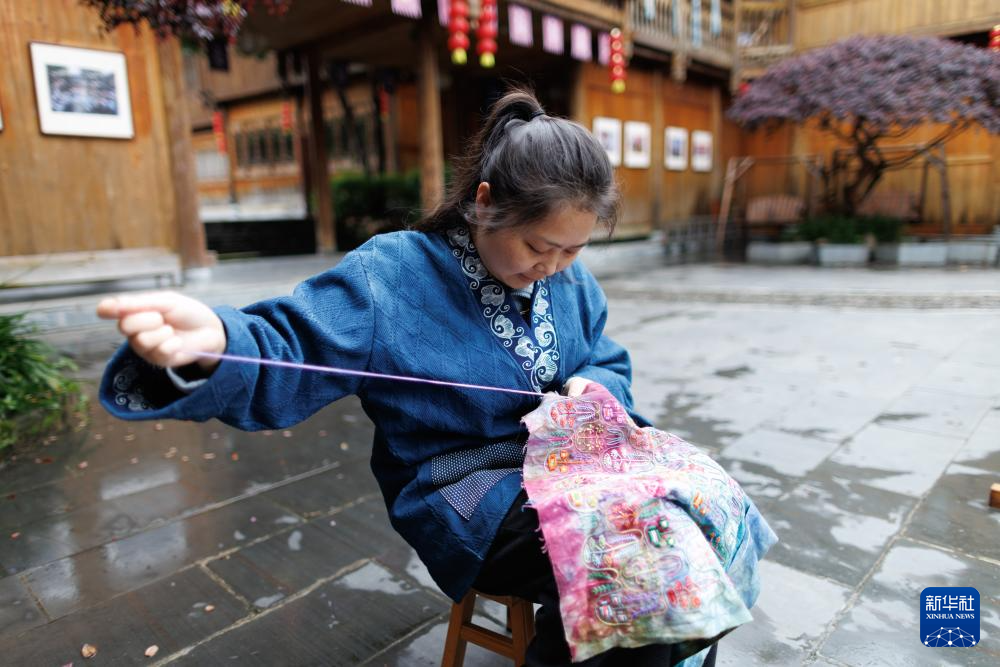 侗族妇女陆雪莲在肇兴侗寨制作一幅刺绣作品(4月21日摄)。新华社记者 刘续 摄
