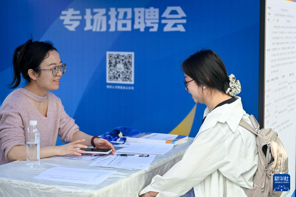 4月25日,在第十四届贵州人才博览会现场,求职者与招聘人员交流。新华社发(袁福洪 摄)