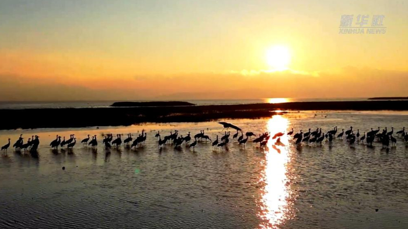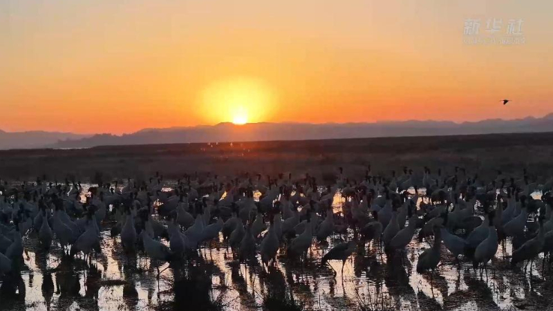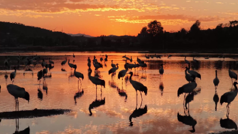 黑颈鹤晚霞中归巢 绝美如音符落镜湖